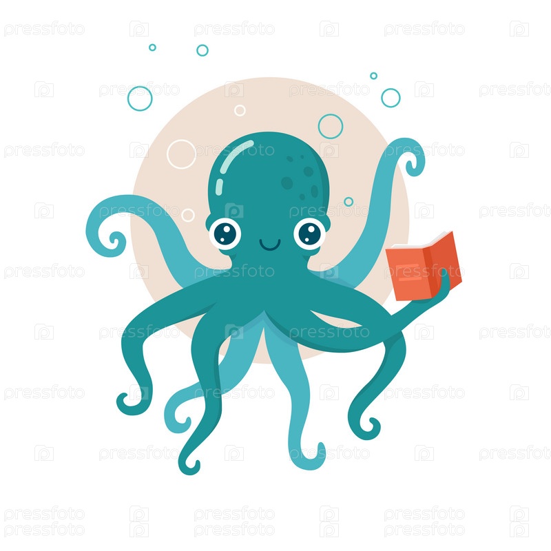 Мультфильм милый сине-зеленый вектор милый осьминог с книгой на белом фоне