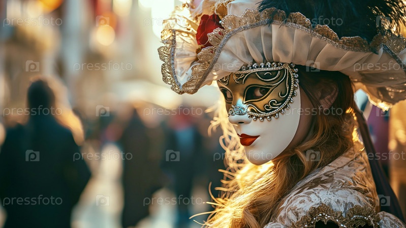 Девушка со светлыми волосами в венецианской маске крупным планом на городской улице