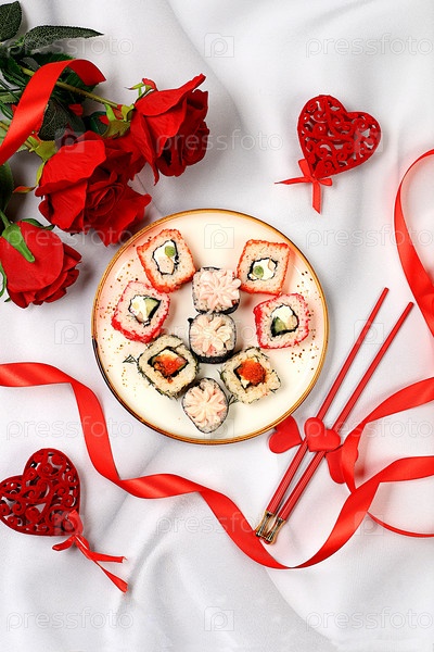 Еда ко Дню святого Валентина, Сердце свежих суши-роллов с розами, традиционная японская кухня, баннер для рекламы или пригласительный бар, меню, место для текста, вид сверху, выборочный фокус