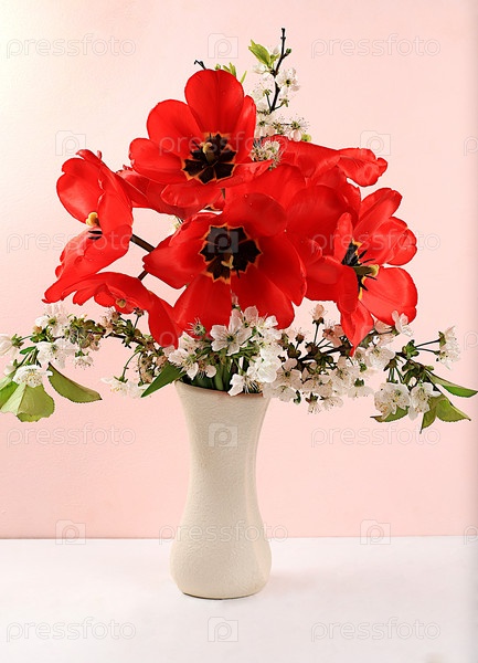 Цветочная композиция с тюльпанами и цветущей вишней в вазе. Минимальный шаблон для дизайна. Концепция женского дня, Дня матери, баннера, поздравления любимому человеку с праздником, днем рождения, выборочный фокус