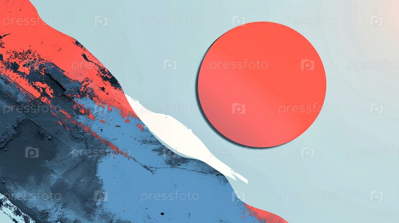 Абстрактный минималистичный рисунок в стиле акварели, на котором на синем фоне изображено красное солнце и синий с белыми и красными горами