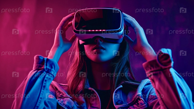Красивая молодая женщина держит в руках виртуальную гарнитуру в неоновом стиле