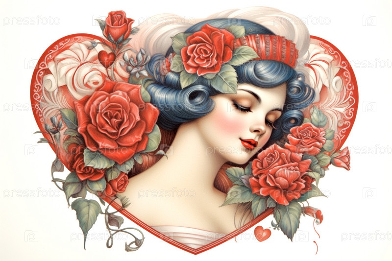 Ретро-открытка ко Дню святого Валентина, на которой в акварельном стиле изображена девушка с сердцем из красных роз вокруг нее