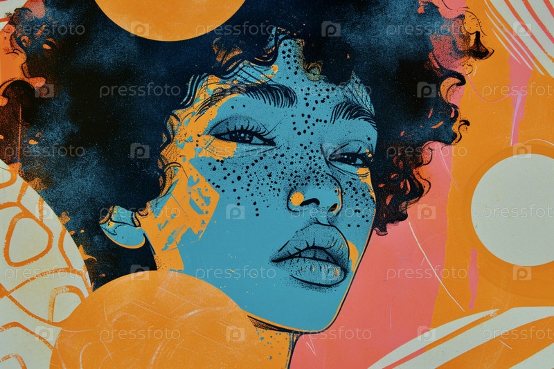 Акварельный рисунок девушки с черными вьющимися короткими волосами на оранжевом фоне