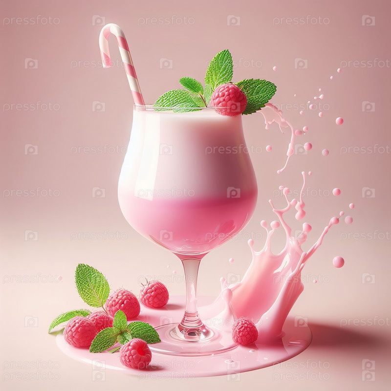 Стакан малинового молочного коктейля со взбитыми сливками и свежей малиной на розовом фоне