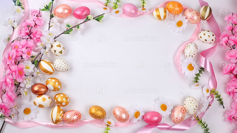 Абстрактная пасхальная композиция, весенний баннер с цветами сакуры и крашеными яйцами с местом для текста, концепция пасхальных праздников, поздравительная открытка