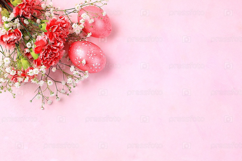 Пасхальная композиция, весенний баннер с гвоздиками и крашеными яйцами с местом для текста, концепция пасхальных праздников, поздравительная открытка, выборочный фокус