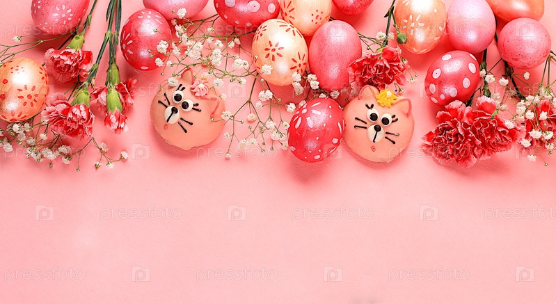 Концепция счастливой Пасхи, весенняя открытка, фон. Украшенные розовые пасхальные яйца на нежном фоне. Минимальная концепция праздника, баннер для экрана