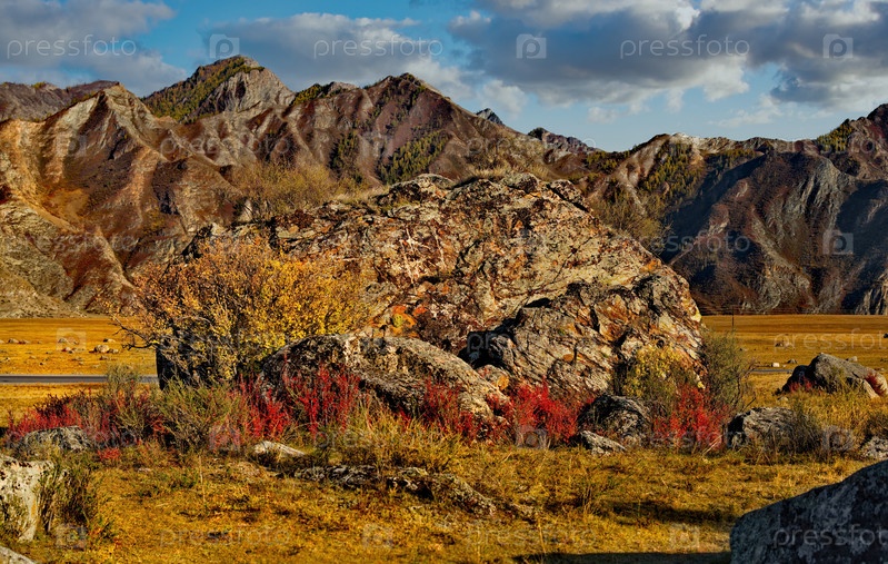 Россия. Юг Западной Сибири. Горный Алтай. Разноцветные каменистые россыпи в долине реки Катуни вдоль Чуйского тракта
