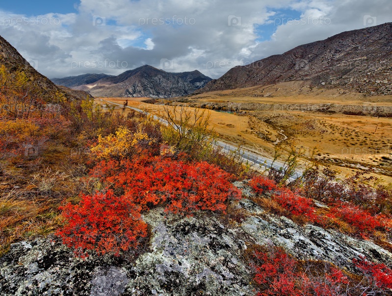 Россия. Юг Западной Сибири. Горный Алтай. Разноцветные каменистые россыпи в долине реки Катуни вдоль Чуйского тракта