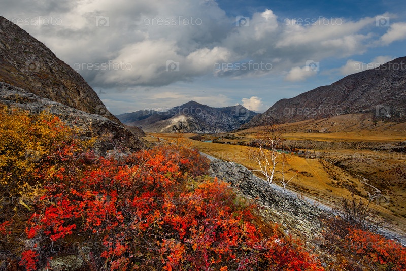 Россия. Юг Западной Сибири. Горный Алтай. Разноцветные каменистые россыпи в долине реки Катуни вдоль Чуйского тракта
