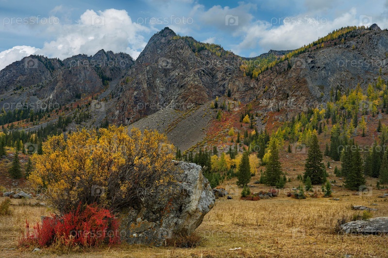 Россия. Юг Западной Сибири. Горный Алтай. Разноцветные каменистые россыпи в долине реки Катуни вдоль Чуйского тракта