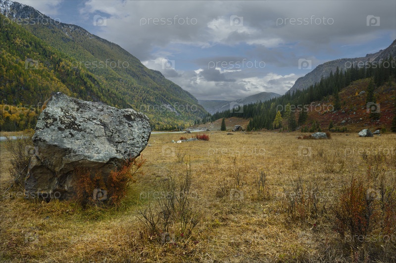 Россия. Юг Западной Сибири. Горный Алтай. Разноцветные каменистые россыпи в долине реки Катуни вдоль Чуйского тракта