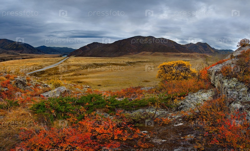 Россия. Юг Западной Сибири. Горный Алтай. Разноцветные каменистые россыпи в долине реки Катуни вдоль Чуйского тракта