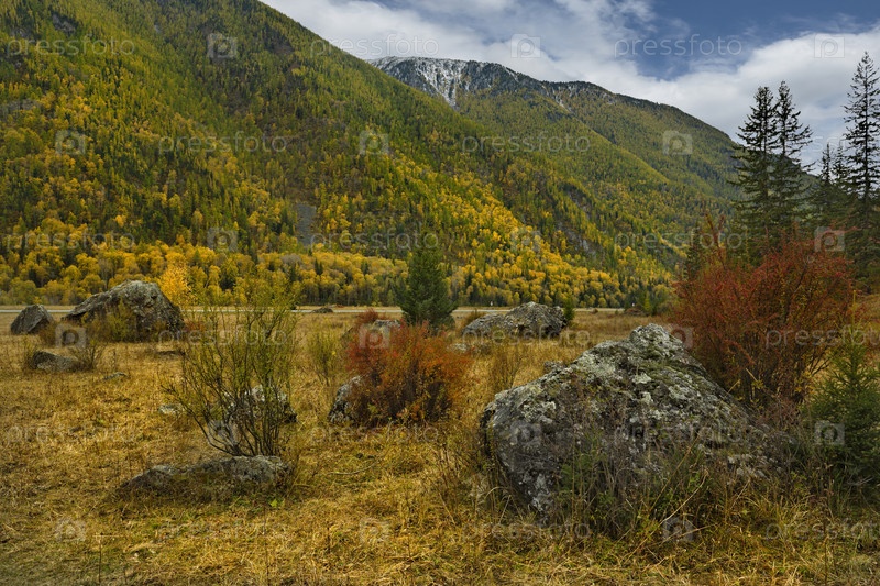 Россия. Юг Западной Сибири. Горный Алтай. Разноцветные каменистые россыпи в долине реки Катуни вдоль Чуйского тракта