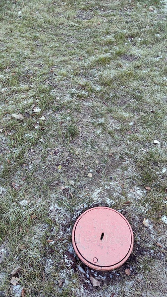 Красный люк на лужайке. Среди лужайки с зеленой травой, на которой лежит первый снег, сделан железный технологический лаз красного цвета небольшого размера для служебного оперативного доступа к канализации