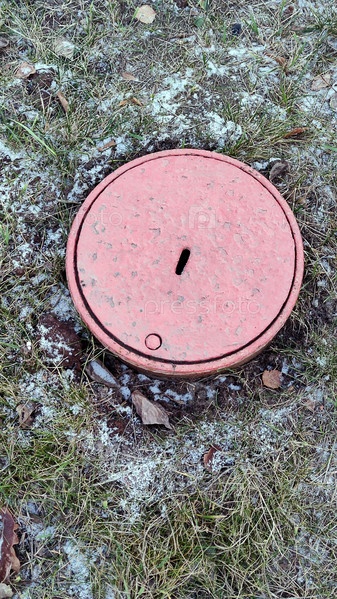 Красный люк на лужайке. Среди лужайки с зеленой травой, на которой лежит первый снег, сделан железный технологический лаз красного цвета небольшого размера для служебного оперативного доступа к канализации