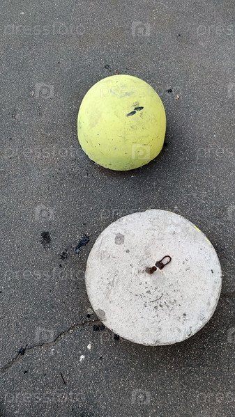 Две бетонные полусферы. На темно-сером асфальте расположены две полусферы из цемента, блокирующие проезд автомобилей. Одно полушарие перевернуто. Они окрашены в желтый цвет