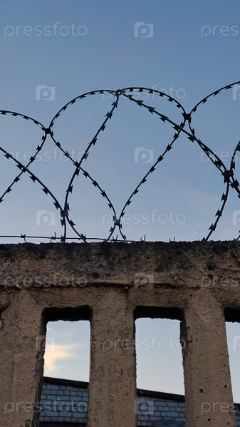 Бетонный забор и колючая проволока. Колючая проволока прикреплена к вершине высокого цементного забора. В бетонном заборе делаются прямые вертикальные отверстия. За забором видно голубое небо с редкими облаками