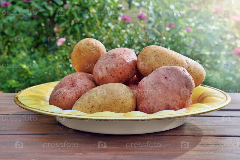 Свежий выкопанный картофель в тарелке на фоне зеленых листьев