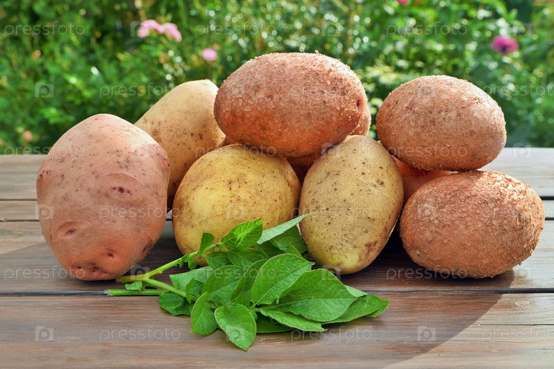 Свежий выкопанный картофель на деревянном столе и на фоне зеленых листьев