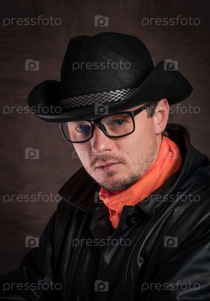 Небритый молодой человек в очках, шляпе и черном плаще