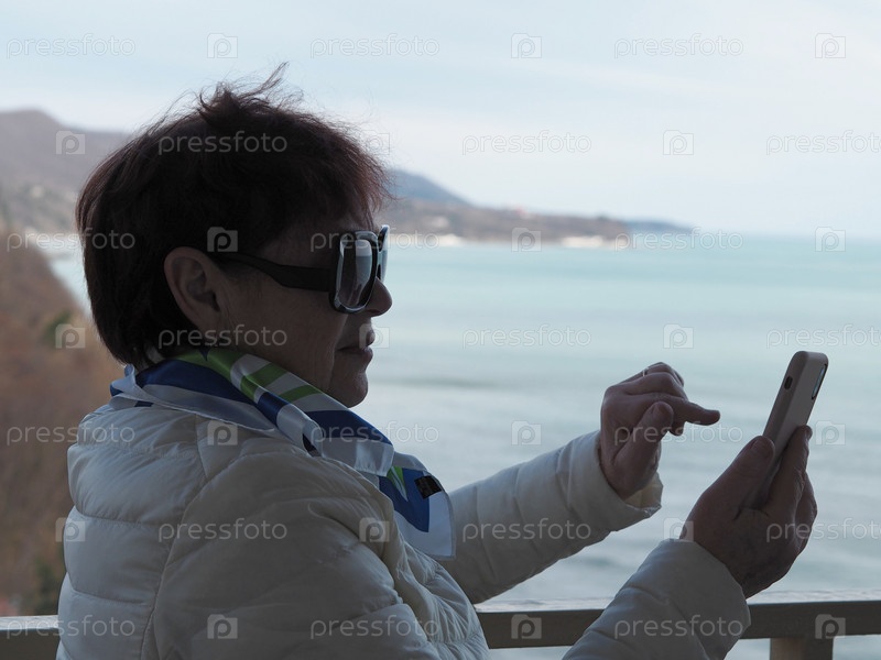 Пожилая женщина пользуется мобильным телефоном, делает селфи с балкона санатория на фоне моря. Использование современных технологий и жизнь пожилых людей