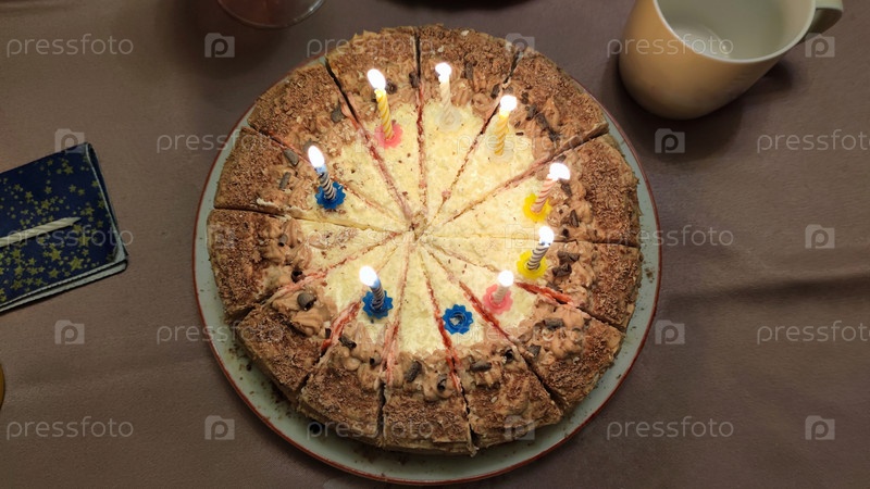 Торт разрезать на кусочки. На темной скатерти стоит тарелка с домашним тортом. Свечи втыкаются в торт и горят. Торт разрезается на ровные треугольные кусочки. Рядом с ним еще одна свеча