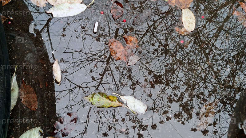 Большая лужа воды на мокром асфальте. Асфальтированная дорога с лужей. Опавшие желтые и коричневые листья деревьев плавают в прозрачной воде. На поверхности отражаются небо и ветви деревьев