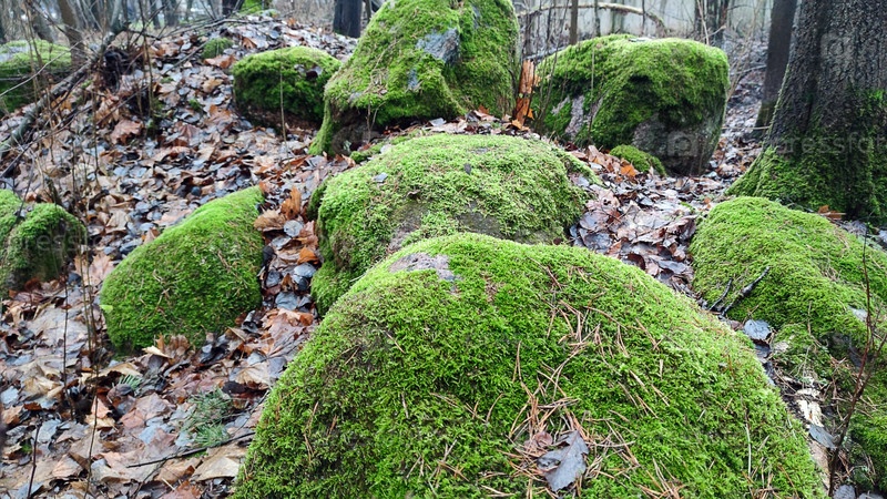 Камни покрыты мхом. На земле среди опавших коричневых листьев и зеленой травы лежат большие сферические камни. Они все зеленым мхом поросли, как у тролля
