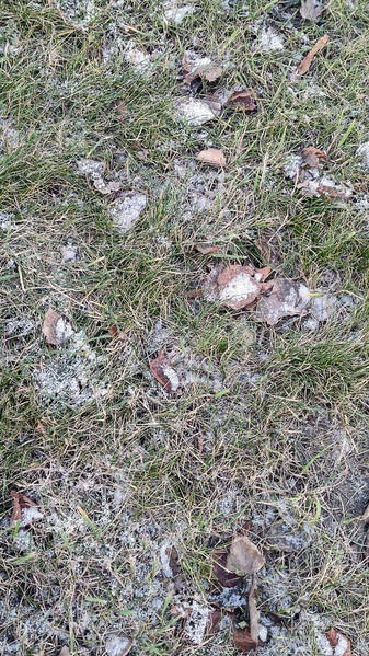 Первый снег на выцветшей лужайке. На невысокой бледно-зеленой траве и опавших бурых листьях местами лежит белый снег. Снег недавно выпал и едва покрыл поверхность земли