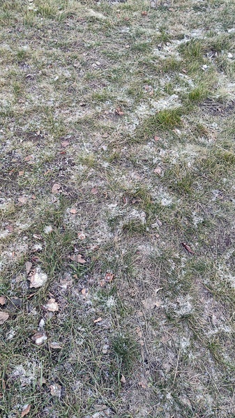 Первый снег на выцветшей лужайке. На невысокой бледно-зеленой траве и опавших бурых листьях местами лежит белый снег. Снег недавно выпал и едва покрыл поверхность земли