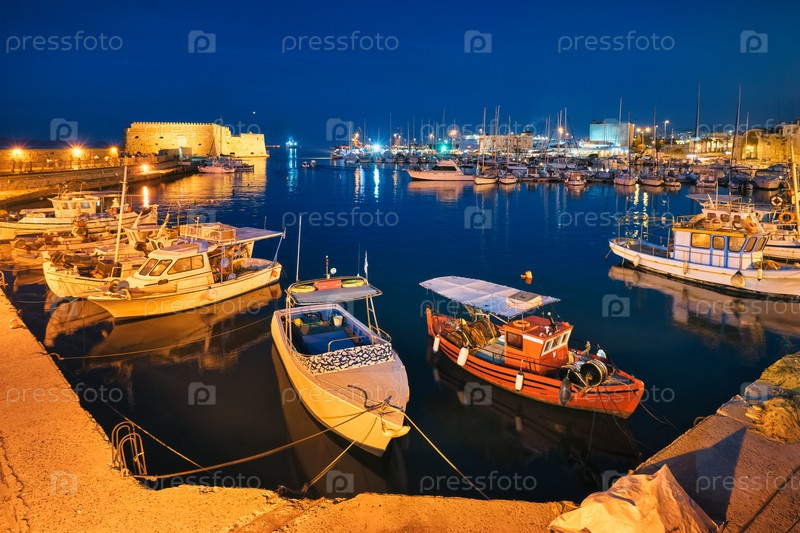 Венецианский замок-форт в Ираклионе и пришвартованные греческие рыбацкие лодки в порту, остров Крит, Греция ночью