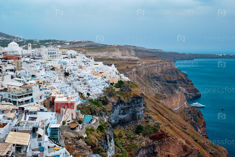 Вид на греческий город Фира с традиционными белыми домами на острове Санторини. Санторини, Греция
