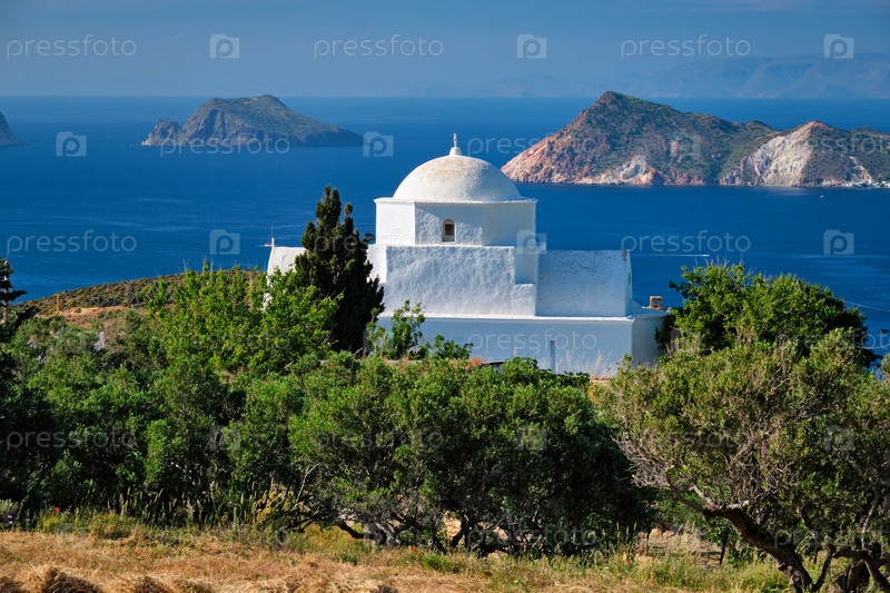 Живописный вид Греческая православная традиционная побеленная церковь на острове Милос на фоне Эгейского моря. Остров Милос, Греция
