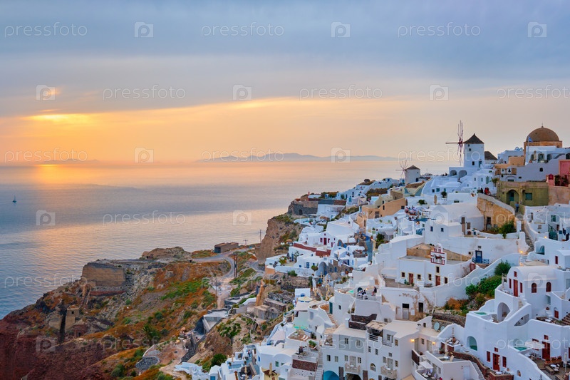 Знаменитое греческое культовое место для селфи, туристическое направление, деревня Ия с традиционными белыми домами и ветряными мельницами на острове Санторини на закате в сумерках, Греция
