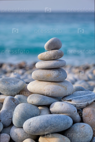 Концепция релаксации дзен-медитации - стопка сбалансированных камней крупным планом на морском пляже