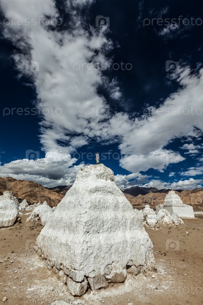 Побеленные чортены тибетских буддийских ступ. Долина Нубра, Ладакх, Индия