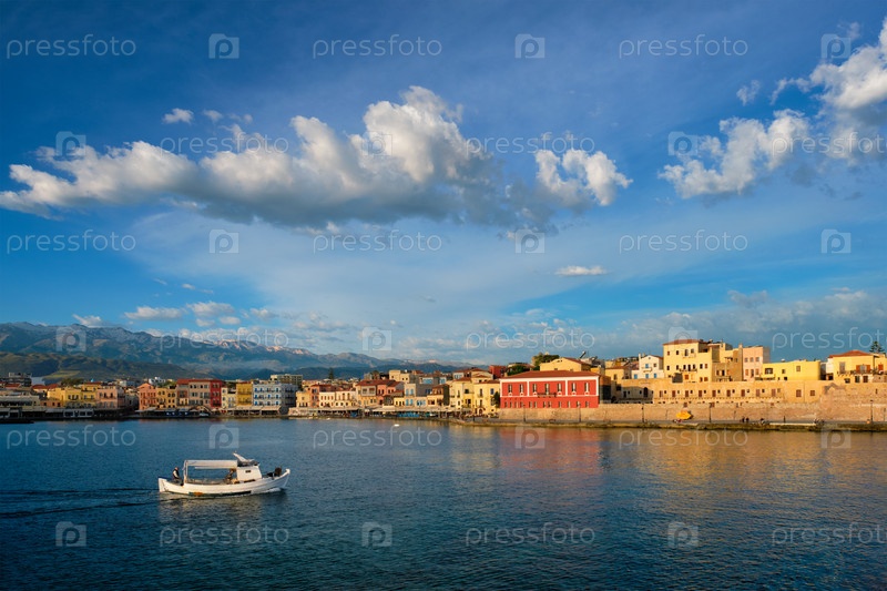 Рыбацкая лодка, идущая утром в море в живописном старом порту Ханья, является одной из достопримечательностей и туристических направлений острова Крит. Ханья, Крит, Греция