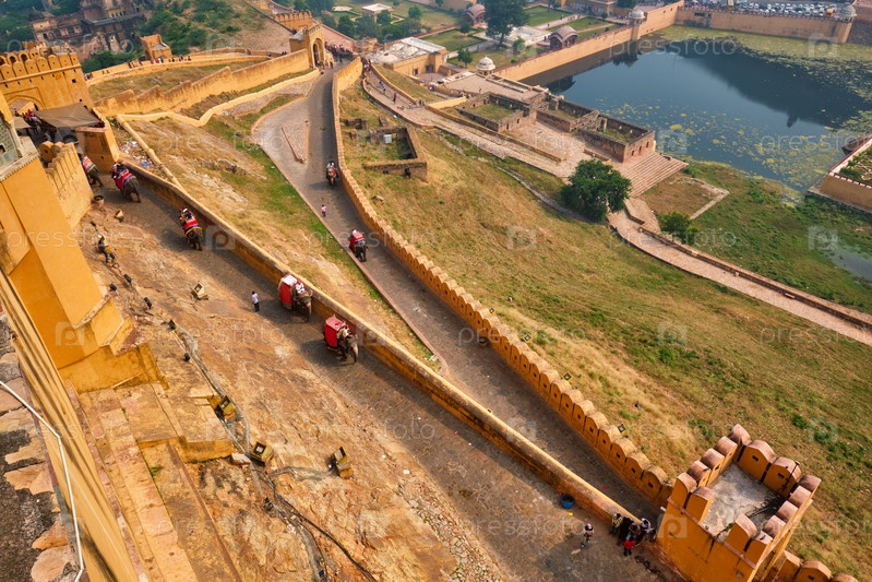 Туристы верхом на слонах поднимаются на форт Амер