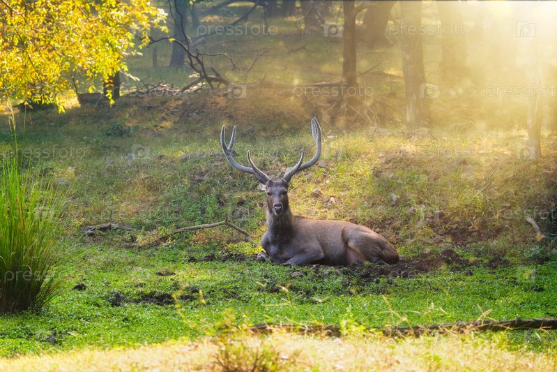 Красивый самцовский одноцветный олень Руса отдыхает в национальном парке Рантхамбор, Раджастхан, Индия
