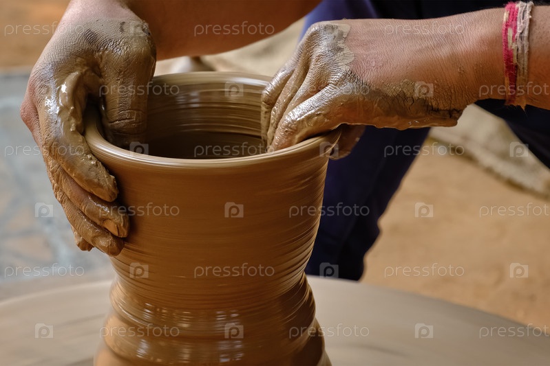 Керамика - умелые влажные руки гончара, формирующие глину на гончарном круге. Горшок, метание вазы. Изготовление традиционной индийской чаши ручной работы, кувшина, горшка, кувшина. Шилпаграм, Удайпур, Раджастхан, Индия