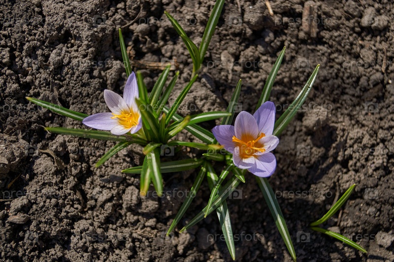 На лужайке в саду цветут крокусы. род многолетних клубневых травянистых растений семейства Иридовые (Iridaceae)