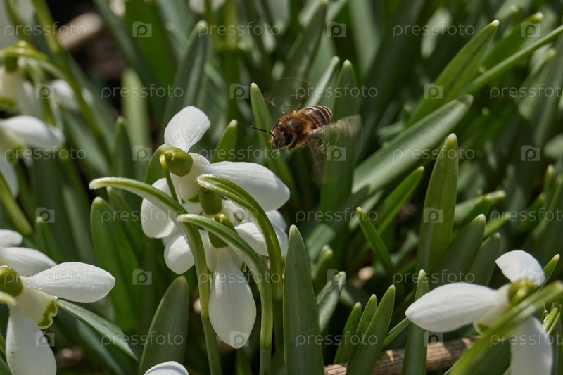 На лужайке в саду цветут подснежники. символ весны. род многолетних трав семейства Амариллидовых (Amaryllidaceae)