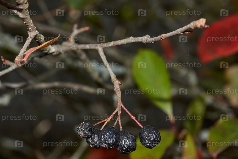Осень. Спелые и увядшие ягоды аронии в саду загородного дома