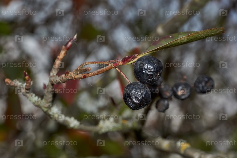 Осень. Спелые и увядшие ягоды аронии в саду загородного дома