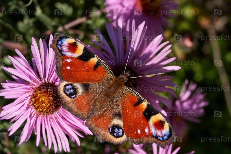 Бабочка 'глаз Павлина' (лат. Aglais io) собирает нектар из цветов