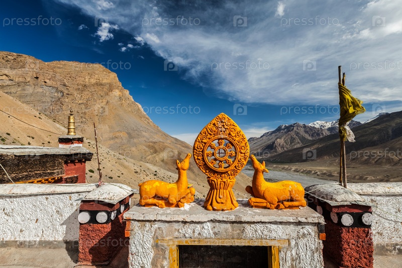 Колесо жизни Дхармачакры в тибетском буддийском монастыре Кей-гомпа. Долина Спити, Химачал-Прадеш, Индия