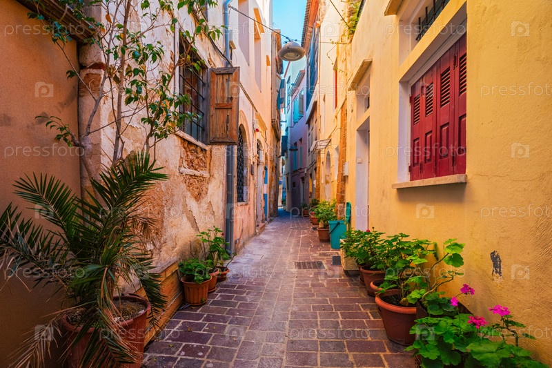 Живописные живописные улицы венецианского города Ханья с красочными старыми домами. Греческая деревня Ханья утром. Чаника, остров Крит, Греция