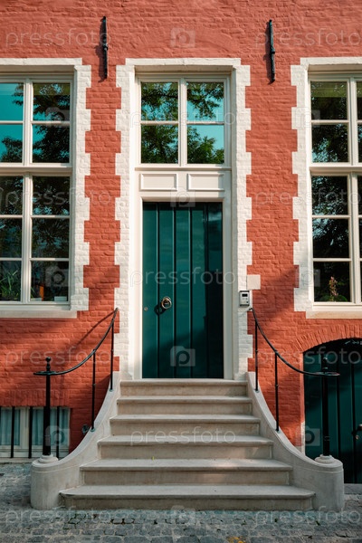 Дверь Брюгге с порогом и окном старого европейского дома. Брюгге, Бельгия